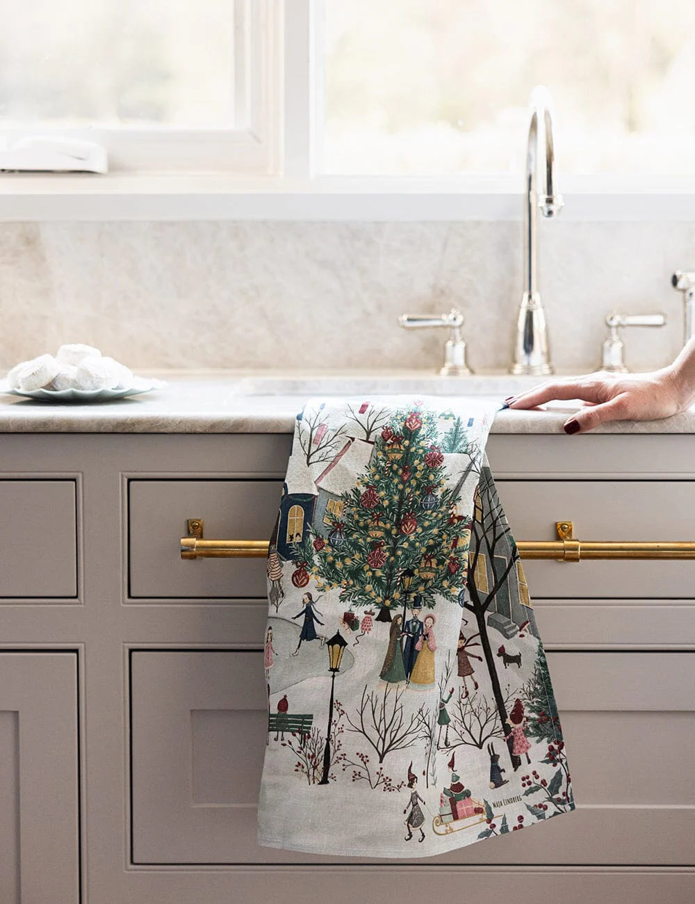 Add a touch of timeless charm to your kitchen with the The Christmas Village Tea Towel. Featuring beautiful artwork by Maja Lindberg, this festive design captures the warmth and nostalgia of the holiday season. Printed on 100% flax linen, it’s naturally durable, absorbent, and softens beautifully with every wash. Supplied folded and finished with a gold foil-printed bellyband, it makes a thoughtful gift or a lovely addition to your Christmas entertaining.