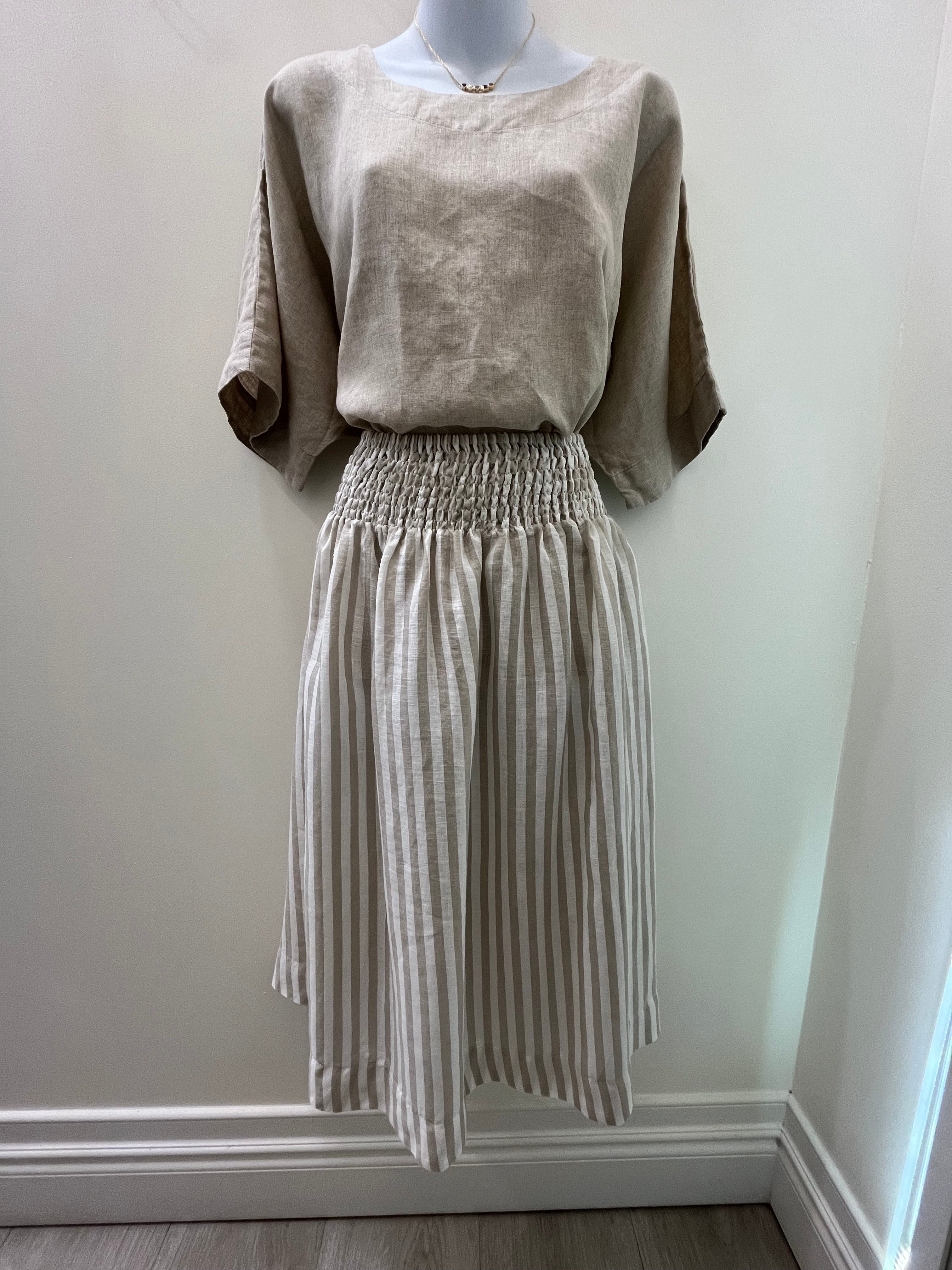 The Lola Skirt in natural stripe is the perfect blend of comfort and effortless style. Falling just below the knees with a flattering mid-length cut, it’s crafted from medium-weight 100% washed European flax linen — ideal for all-season wear.