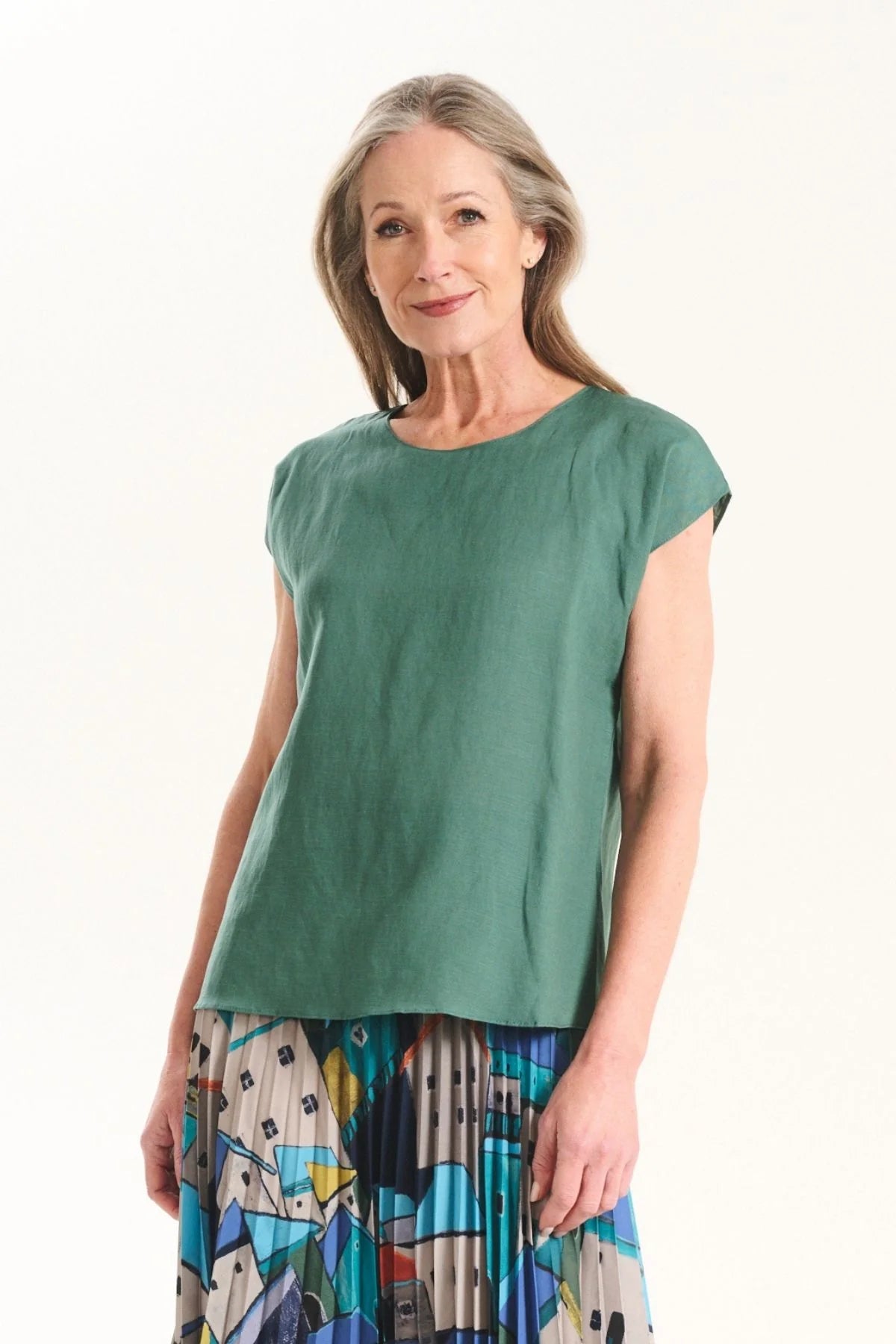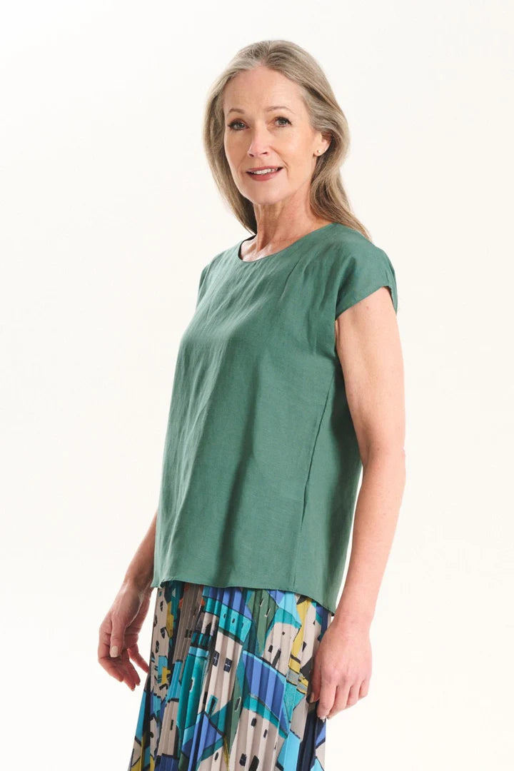 A true staple, our Signature Tee is the perfect blend of comfort and sophistication. Crafted from a luxurious Linen and Tencel blend, it offers a breathable, lightweight feel with a gently tailored silhouette. The slim fit and slightly tapered waist flatter the figure, while cap sleeves and a round neckline keep the look timeless and versatile. A subtle button fastening at the back adds an elevated touch. Ideal for dressing up with a blazer or keeping it casual with jeans, this tee is designed for everyday wear. Pair perfectly with our Pueblito Pleated Skirt.