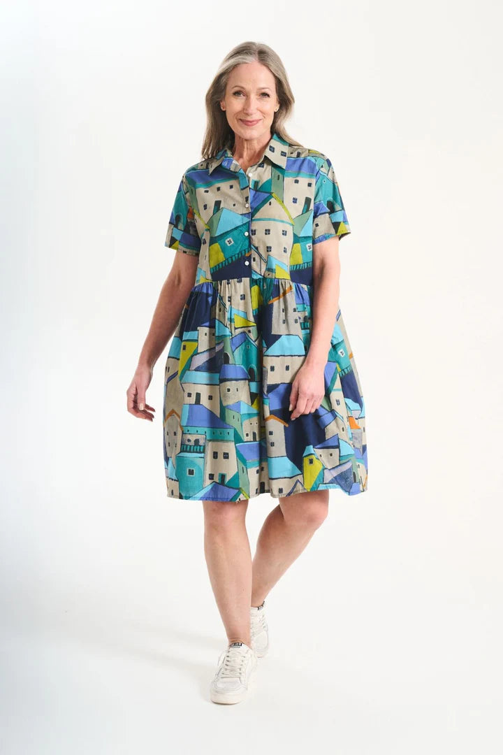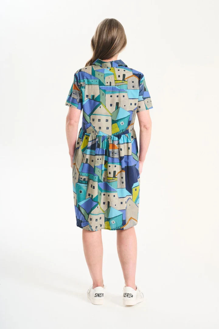 Effortlessly cool and incredibly comfortable, the Villa Dress in Pueblito Blue is your new go-to for easy everyday style. Crafted from lightweight 100% cotton, this relaxed shirt dress features a boxy silhouette, button-up front, and a classic collar for a laid-back yet polished look. With dropped shoulders, short sleeves, and side pockets, it’s a versatile piece you'll reach for all season long. Each garment is unique, with print placement varying per dress.