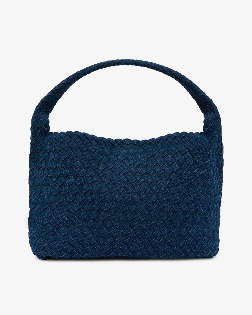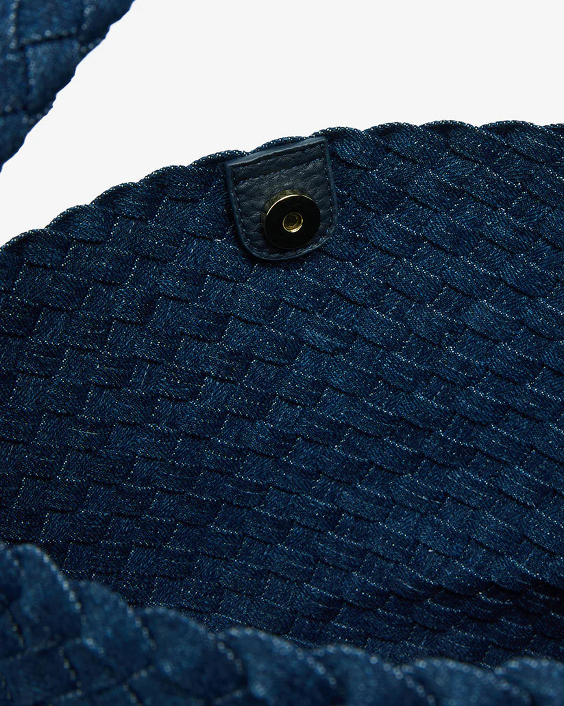 The Arcadia Tote in Denim Plait is made from 100% cotton denim, intricately hand-plaited for a textured finish that balances casual ease with refined craftsmanship. Its classic hobo silhouette offers effortless versatility, while a top magnetic closure secures the roomy interior—spacious enough to hold all your daily essentials with ease.