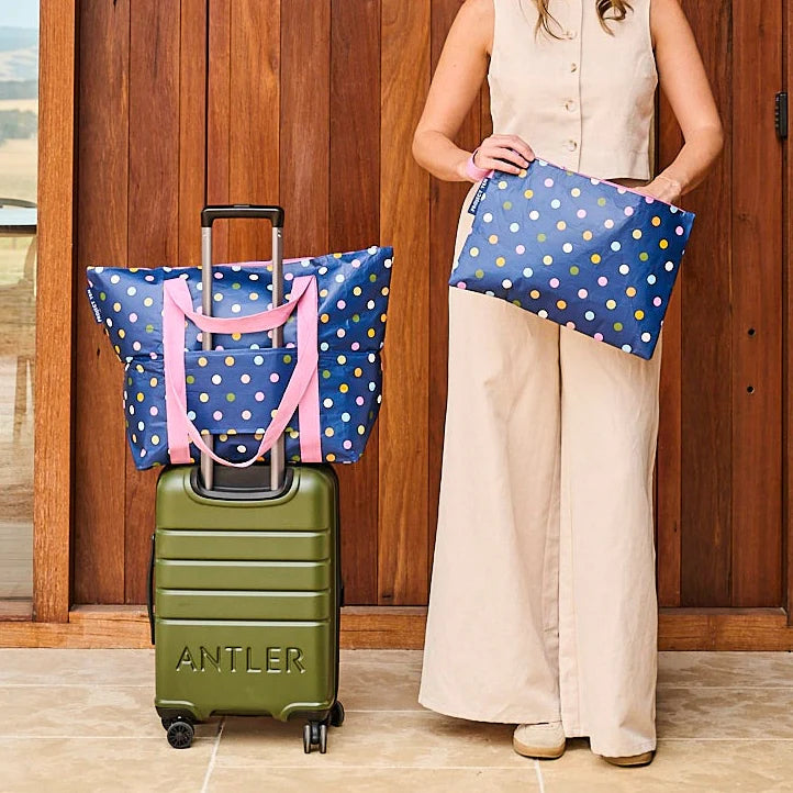 With a secure zip closure, longer shoulder straps, short carry handles, and a luggage band that fits neatly over your suitcase handle, this Zip Medium Tote is designed for effortless travel and everyday use, ideal for swimming lessons, market shopping, sports gear, overnight stays, or as an extra travel bag, featuring a spacious main compartment and an internal zip pocket to keep essentials organised and secure (42 × 62 cm; internal pocket 20 × 25 cm); made from durable wipe-clean recycled plastic (RPET); note: print placement may vary to reduce fabric wastage.