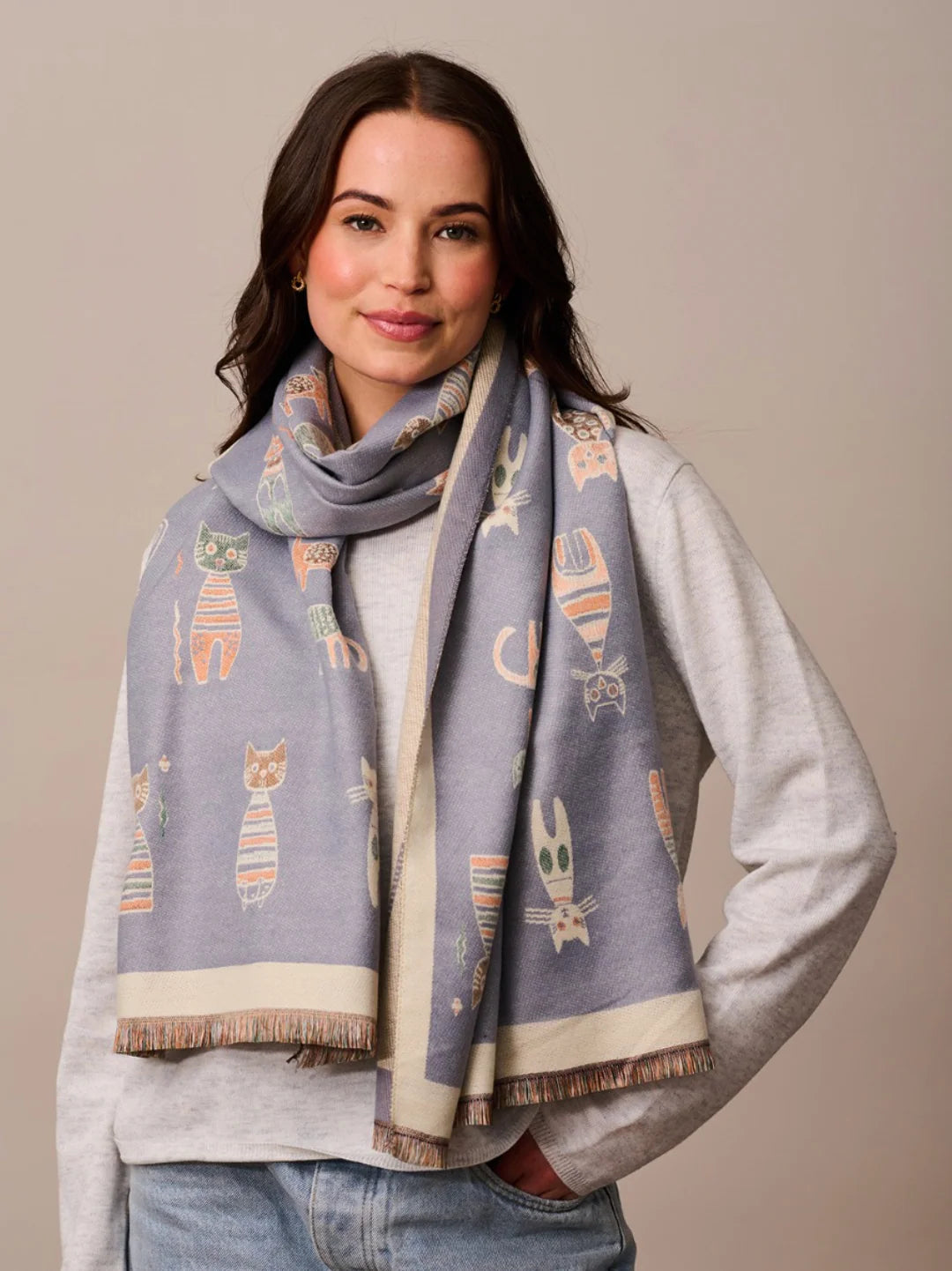 Add a playful and cozy touch to your wardrobe with this whimsical cat-print scarf. Crafted from 100% viscose, it features an array of colorful, striped cats on a soft muted background, making it both fun and stylish. Its generous size allows versatile styling, perfect for draping, wrapping, or layering for warmth and flair.