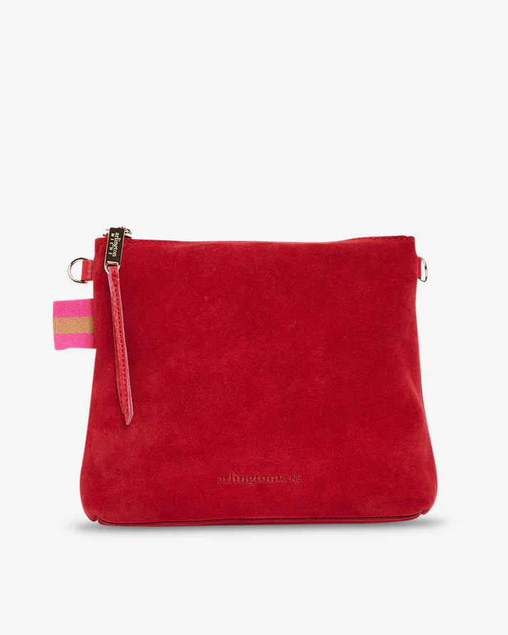The Arlington Milne Alexis Crossbody in Red Suede is crafted from premium leather suede. The bag features light gold hardware, an embossed logo and an adjustable/removable crossbody strap with raw edge detail. Secured with a top zipper, the bag opens to reveal Arlington Milne's signature hot pink lining and 3 leather card slots.