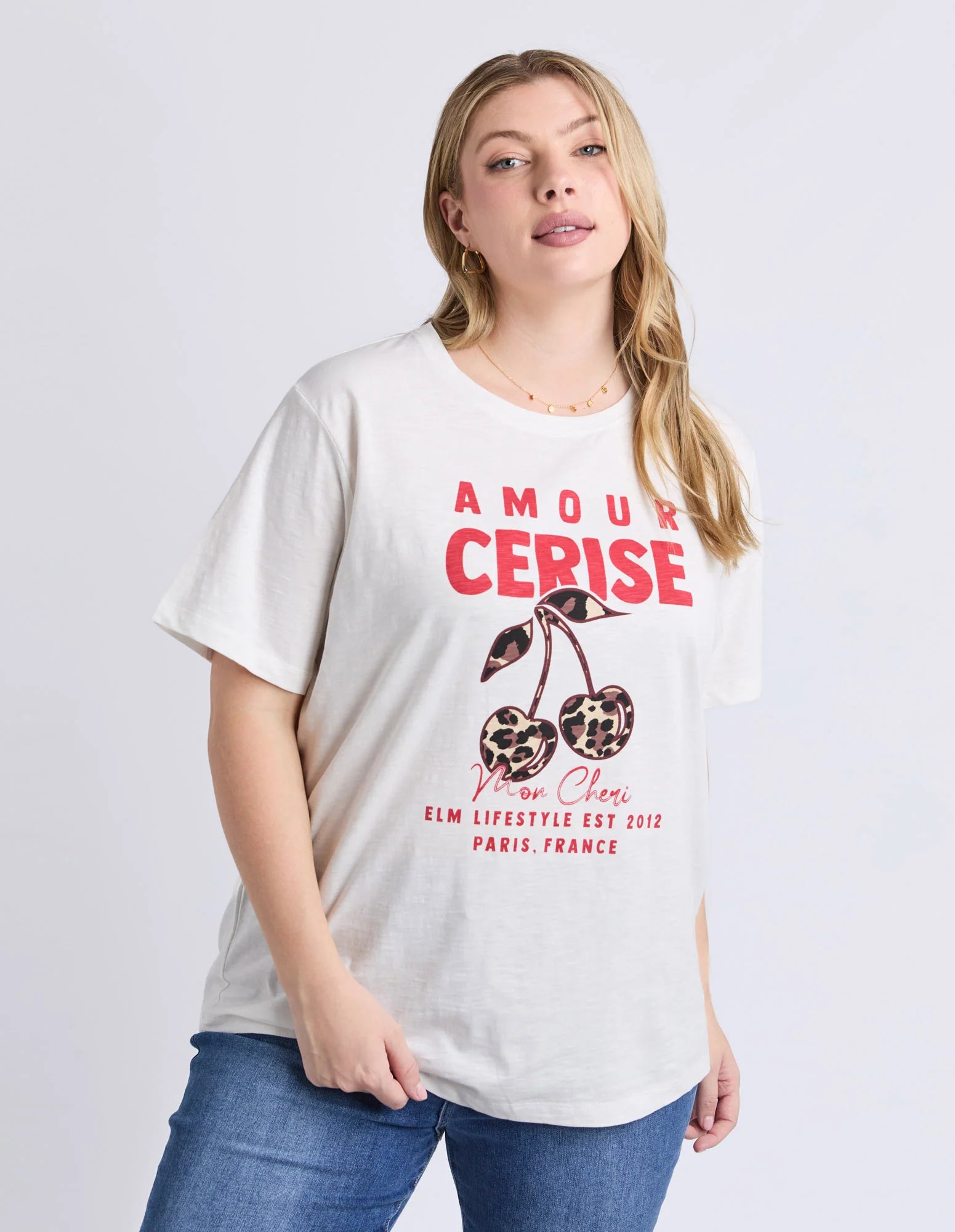 The surprise combo of the season is cherries and leopard print — and we’re obsessed. Elm brings a touch of wild, fruity fun with the Amore Cerise Cotton Tee. Featuring a round neckline, short sleeves and a relaxed fit, this tee is finished with a text and leopard cherry graphic and a curved high-low hemline. Cheerful, effortless and perfect for refreshing your tee collection
