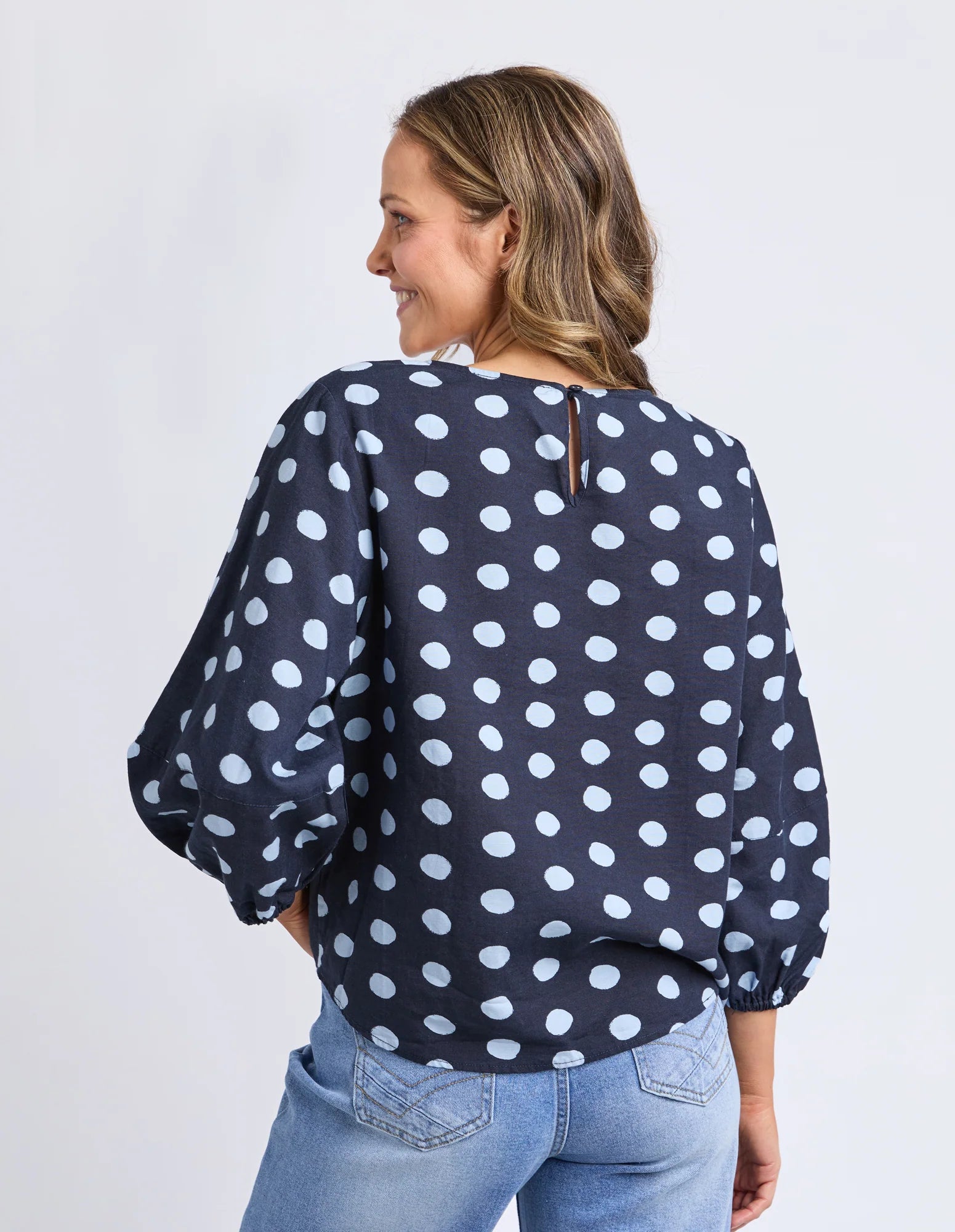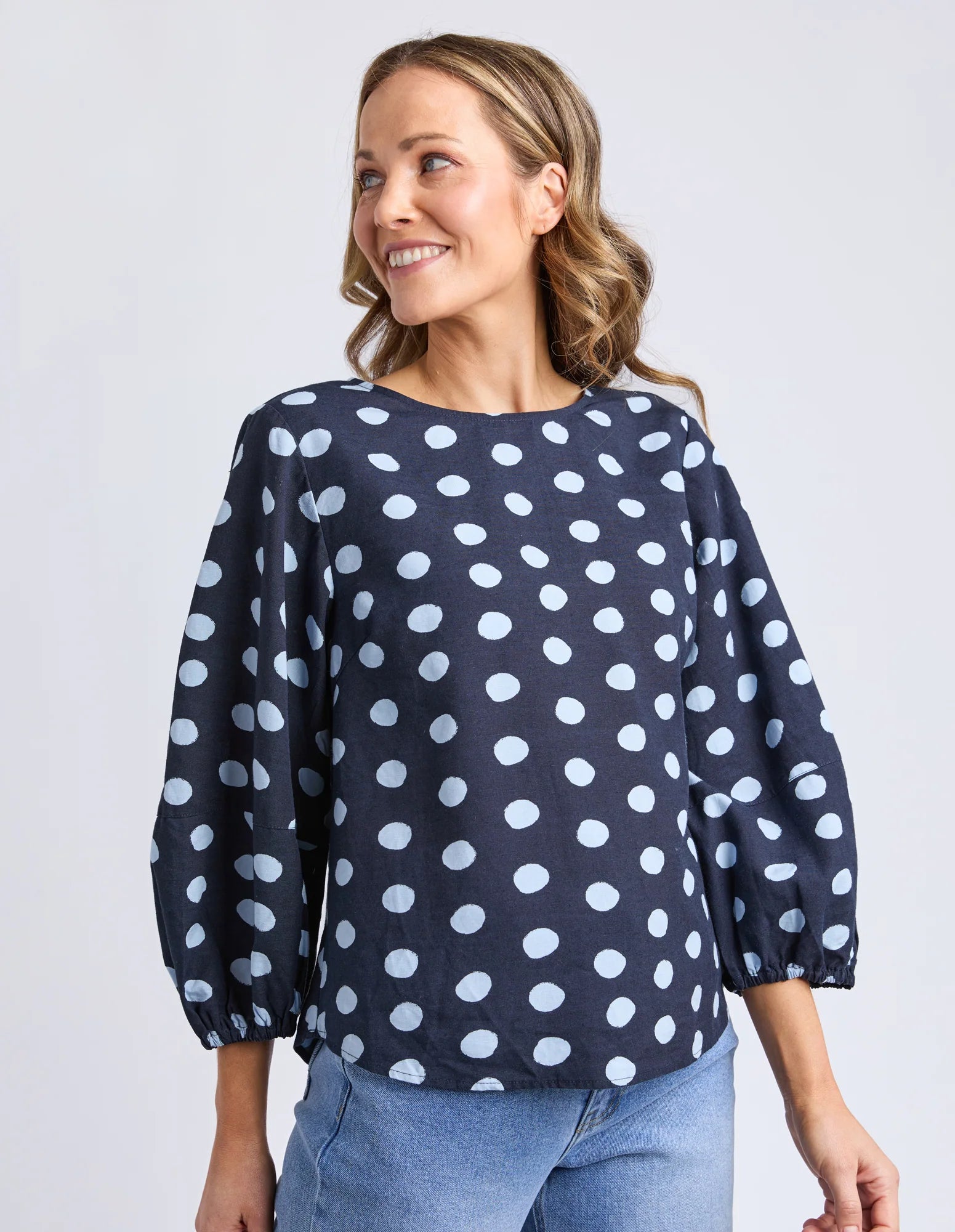 The Elm Dotty Top is a best-selling favourite, loved for its relaxed shape and effortless style. Statement balloon sleeves with elastic cuffs add a modern touch, while the soft blue base with a pale blue spot creates a subtle yet standout finish. Perfect for everyday wear with personality.