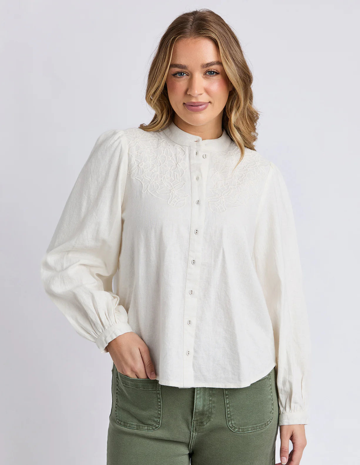 The Eleanor Shirt is a versatile desk-to-dinner staple, combining elegant detailing with an easy-to-wear silhouette. Designed with a refined high neckline and full button-through front, it features delicate embroidery across the chest for a subtle statement. Long sleeves with soft gathered volume add a graceful, feminine finish.