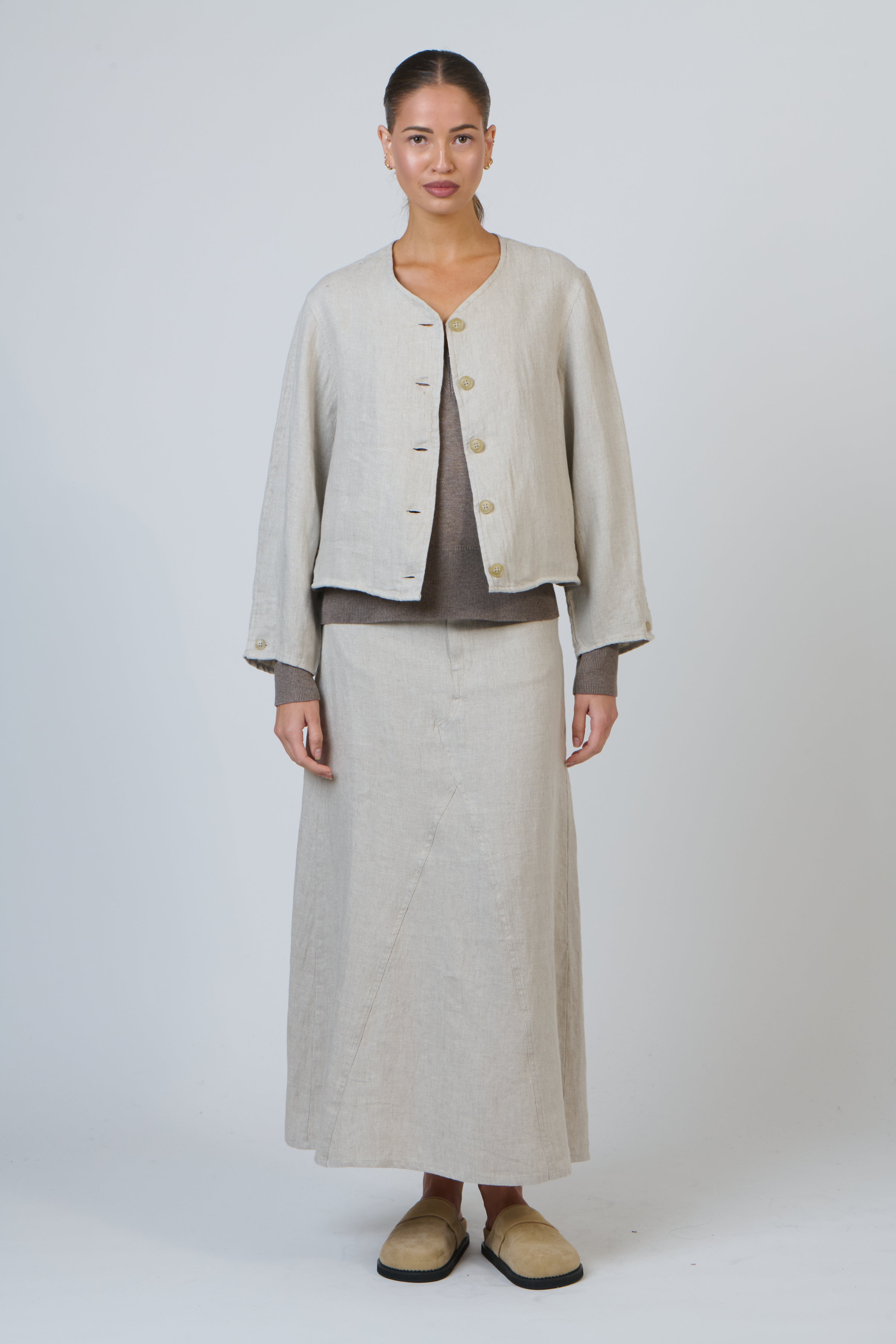 This functional lightweight jacket brings a subtle, artisanal charm to your wardrobe. Crafted from 100% breathable linen, it offers effortless comfort while maintaining a clean, refined look. The collarless round neckline and simple button-front create a minimalist aesthetic, while the relaxed boxy fit sits neatly at the natural waist — perfect for layering over high-waisted pieces or dresses.