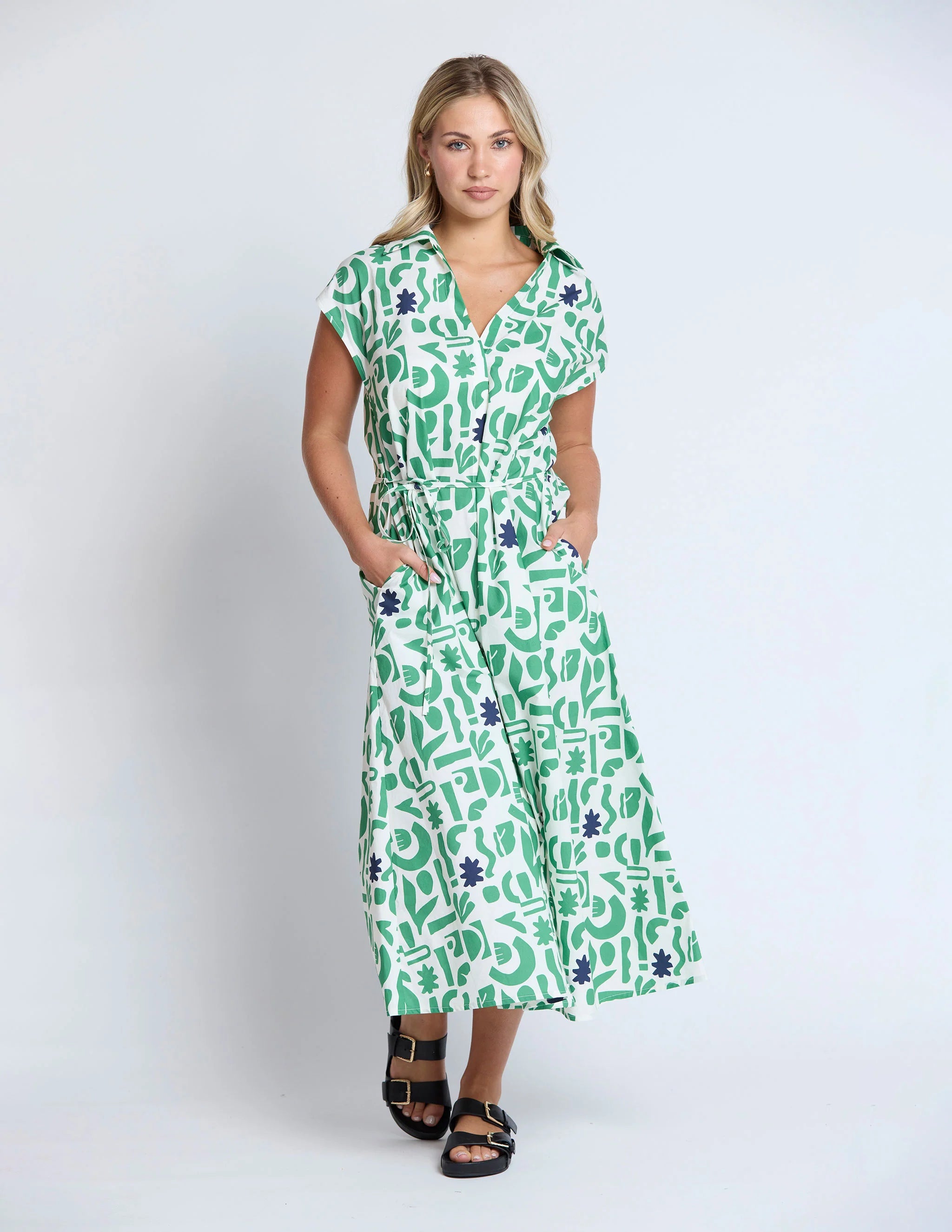 This midi dress features cap sleeves, a concealed button-front placket, and an open collar neckline for a polished yet relaxed feel. Designed with practical side pockets and a self-fabric narrow tie belt to cinch the waist, it’s an effortlessly versatile piece for any occasion.